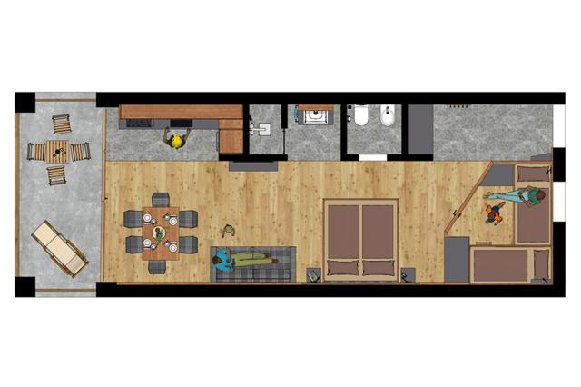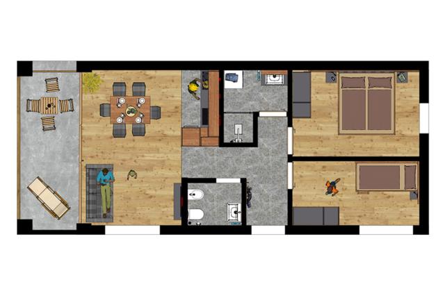posteľou, sociálne zariadenie, balkón alebo terasa #trilo 5/6: 50 m² - 1 spálňa s manželskou posteľou, 1 spálňa s 1 samostatným lôžkom a poschodovou posteľou alebo 2 poschodovými posteľami, obývacia izba s kuchynským kútom a manželskou posteľou, sociálne zariadenie, balkón alebo terasa |